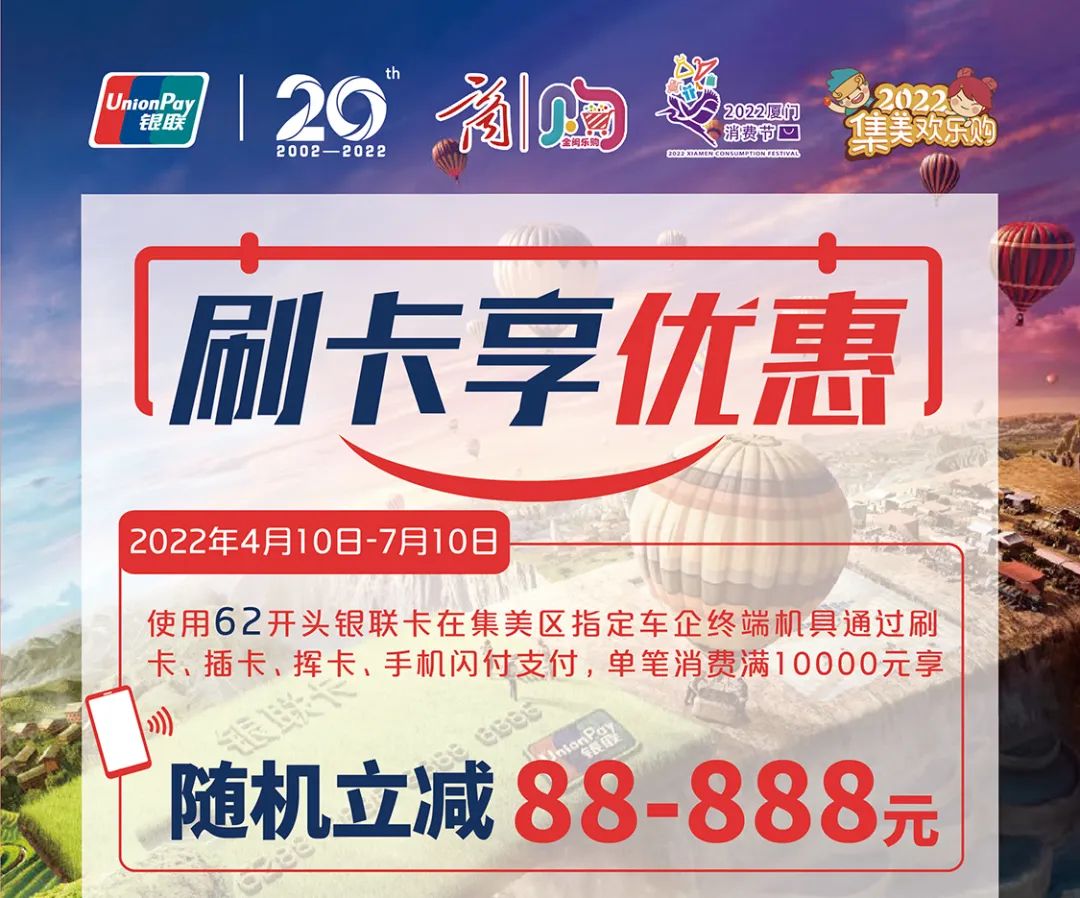 使用流程:持卡人使用卡號62開頭的銀聯(lián)卡(含信用卡和借記卡),在集美區(qū)指定車企終端機具,通過刷卡、插卡、揮卡、手機閃付支付: