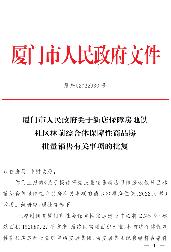 近日,廈門市人民政府發(fā)布關(guān)于新店保障房地鐵社區(qū)林前綜合體保障性商品房批量銷售有關(guān)事項的批復。