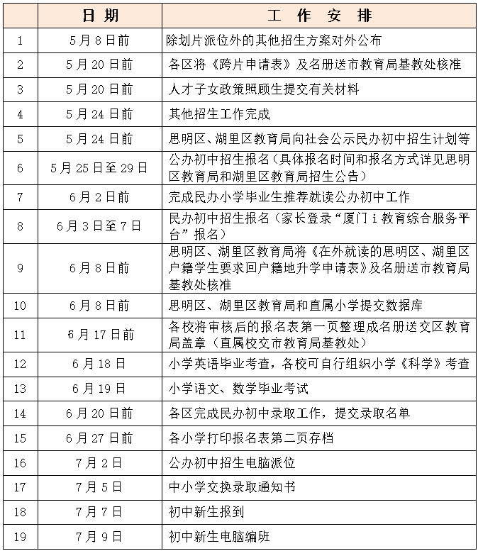 1.思明、湖里區(qū)初中招生報名時間為5月25日至29日,具體報名時間和報名方式詳見思明區(qū)教育局和湖里區(qū)教育局招生公告;其他區(qū)的報名時間和報名方式由各區(qū)教育局確定并公布。