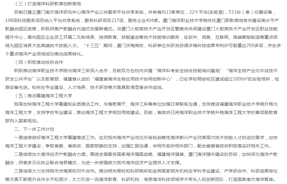 廈門市教育局加快海洋工程大學(xué)籌建和實質(zhì)推動工作。與省教育廳、海洋三所等單位加強(qiáng)日常聯(lián)系溝通,支持推進(jìn)福建海洋職業(yè)技術(shù)學(xué)院升格為海洋工程大學(xué),支持學(xué)校專業(yè)建設(shè),推動海洋工程大學(xué)規(guī)劃用地建設(shè)。目前,省政府已將海洋職業(yè)技術(shù)學(xué)院升格海洋工程大學(xué)的事項報教育部列入國家規(guī)劃。