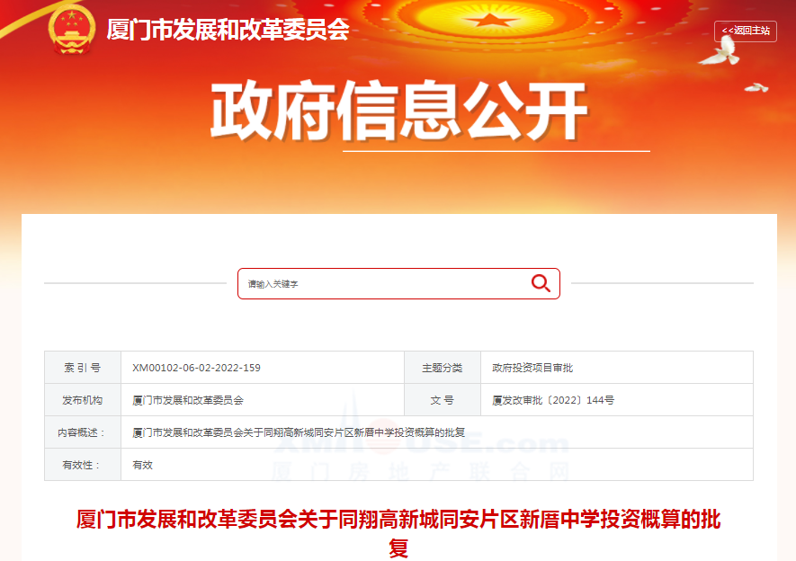 剛剛,廈門市發(fā)展和改革委員會(huì)發(fā)布關(guān)于同翔高新城同安片區(qū)新厝中學(xué)投資概算的批復(fù),同意批準(zhǔn)同翔高新城同安片區(qū)新厝中學(xué) 投資概算。