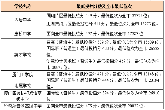 廈門(mén)市2020年中招普高學(xué)校最低投檔分?jǐn)?shù)和位次