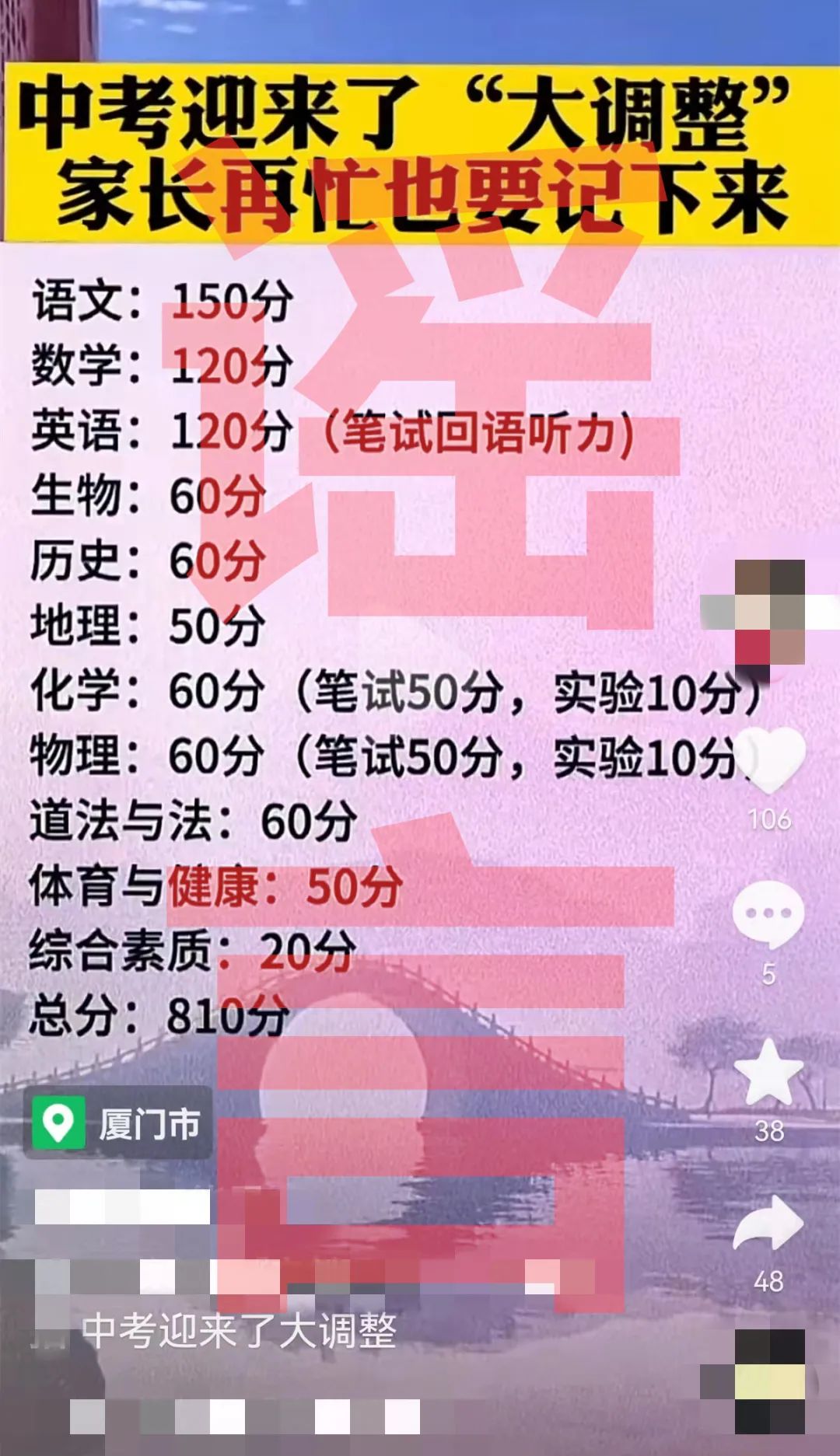 根據(jù)這條抖音的消息,中考總分810分,化學(xué)和物理的實驗也算分,各10分,還有個綜合素質(zhì)分,計分20分。