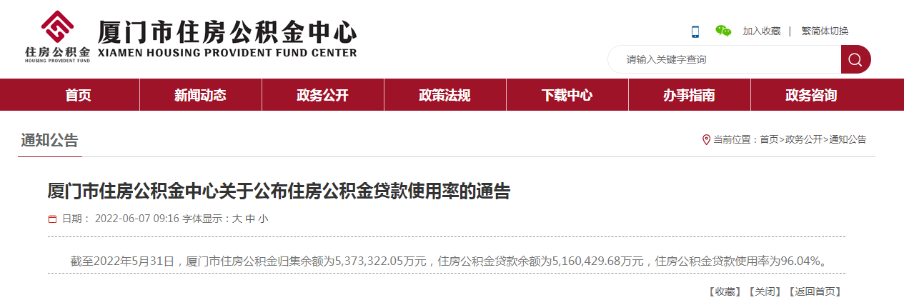 廈門市住房公積金中心發(fā)布關(guān)于公布住房公積金貸款使用率的通告,截至2022年5月31日,廈門市住房公積金歸集余額為5,373,322.05萬(wàn)元,住房公積金貸款余額為5,160,429.68萬(wàn)元,住房公積金貸款使用率為96.04%。