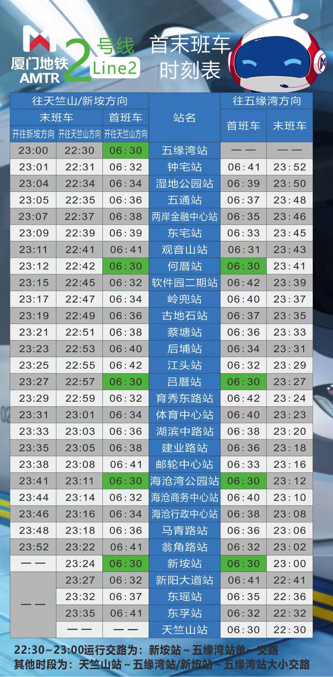 途經(jīng)站點(diǎn):天竺山站、東孚站、新陽(yáng)大道站、新垵站、翁角路站、馬青路站、海滄行政中心站、海滄商務(wù)中心站、海滄灣公園站、郵輪中心站、建業(yè)路站、湖濱中路站、體育中心站、育秀東路站、呂厝站、江頭站、后埔站、蔡塘站、古地石站、嶺兜站、軟件園二期站、何厝站、觀音山站、東宅站、兩岸金融中心站、五通站、濕地公園站、鐘宅站、五緣灣站