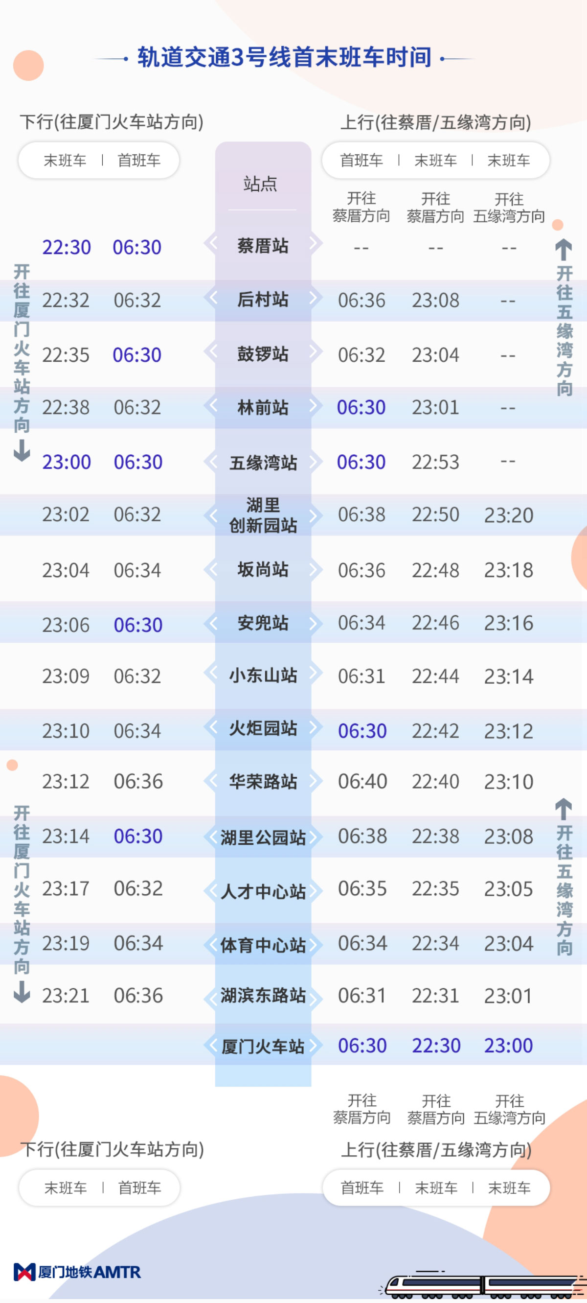 小交路(廈門火車站—五緣灣站)、(五緣灣站—廈門火車站)末班車發(fā)車時(shí)間為23:00。
