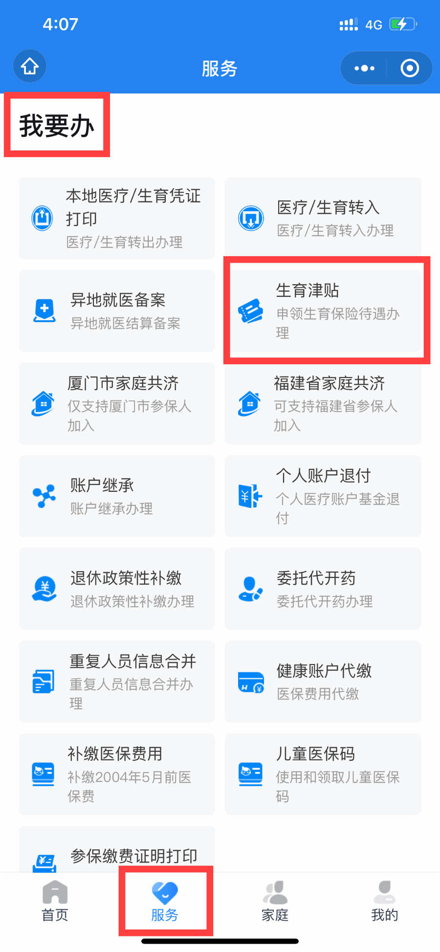 3.點(diǎn)擊“服務(wù)”模塊,找到“我要辦”——“生育津貼”,按提示操作即可