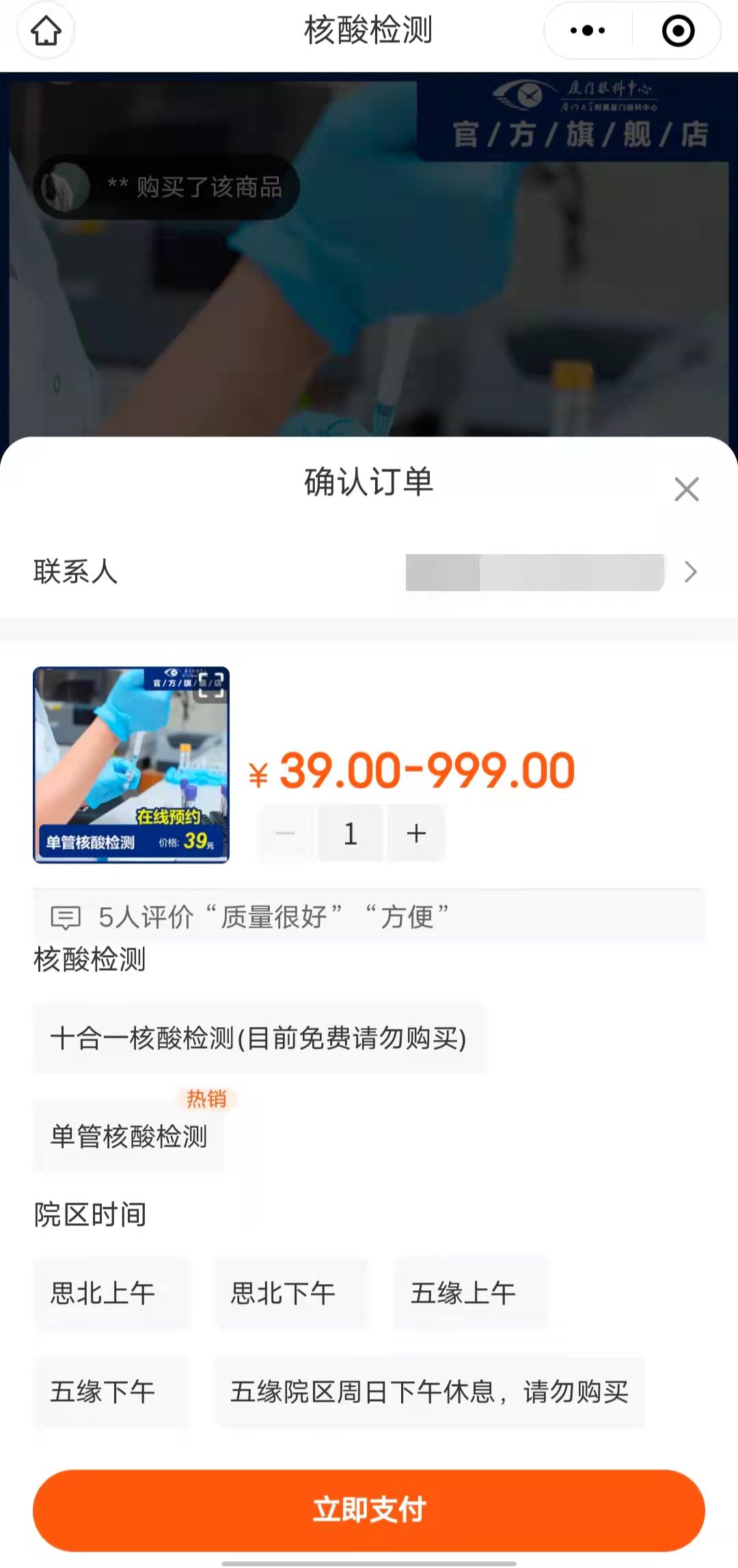 點擊“核酸預(yù)約→核酸檢測購買→填寫聯(lián)系人→選擇要做的核酸類型、院區(qū)和時間→立即支付即可。