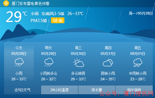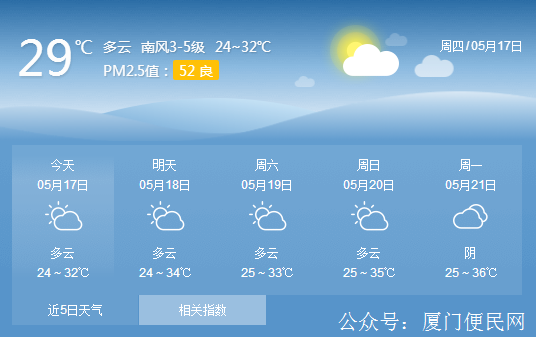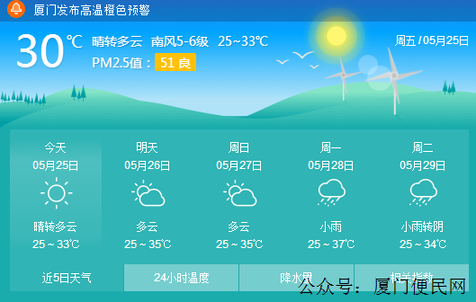 廈門便民網(wǎng)訊:昨天,在副高控制下,廈門又是晴熱的一天。島內(nèi)午間最高氣溫達(dá)到34℃左右,島外海滄、集美、同安部分地區(qū)則達(dá)到35℃。