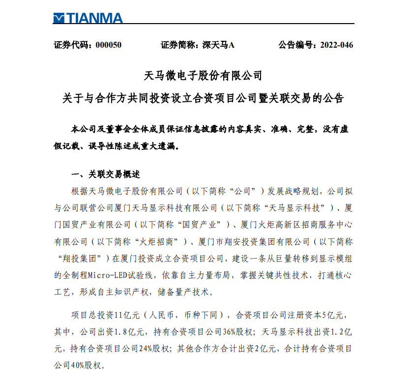 6月22日,深天馬A發(fā)布公告稱(chēng),公司擬與公司聯(lián)營(yíng)公司廈門(mén)天馬顯示科技有限公司(以下簡(jiǎn)稱(chēng)“天馬顯示科技”)、廈門(mén)國(guó)貿(mào)產(chǎn)業(yè)有限公司(以下簡(jiǎn)稱(chēng)“國(guó)貿(mào)產(chǎn)業(yè)”)、廈門(mén)火炬高新區(qū)招商服務(wù)中心有限公司(以下簡(jiǎn)稱(chēng)“火炬招商”)、廈門(mén)市翔安投資集團(tuán)有限公司(以下簡(jiǎn)稱(chēng)“翔投集團(tuán)”)在廈門(mén)投資成立合資項(xiàng)目公司,建設(shè)一條從巨量轉(zhuǎn)移到顯示模組的全制程Micro-LED試驗(yàn)線,依靠自主力量布局,掌握關(guān)鍵共性技術(shù),打通核心工藝,形成自主知識(shí)產(chǎn)權(quán),儲(chǔ)備量產(chǎn)技術(shù)。