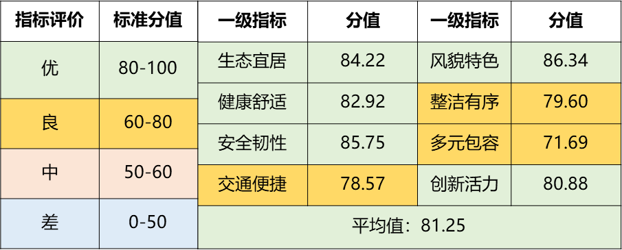 2022年度,按照住建部關(guān)于城市體檢的工作要求,從生態(tài)宜居、健康舒適、安全韌性、交通便捷、風貌特色、整潔有序、多元包容、創(chuàng)新活力8個方面,以“69+9”項指標體系為基礎(chǔ)進行全面體檢。