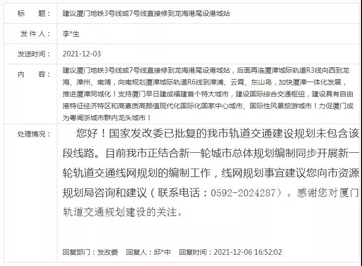 他提及將廈門地鐵3號(hào)線或7號(hào)線直接修到龍海港尾設(shè)港城站后,再連廈漳城際軌道R3線向西到龍海、漳州、南靖,向南規(guī)劃廈漳城際軌道R6線到漳浦、云霄、東山島,加快廈漳一體化發(fā)展,推進(jìn)廈漳同城化!