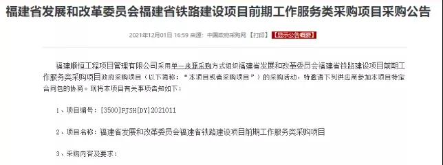 12月1日,《福建省發(fā)展和改革委員會(huì)福建省鐵路建設(shè)項(xiàng)目前期工作服務(wù)類采購(gòu)項(xiàng)目采購(gòu)公告》發(fā)布,6個(gè)鐵路項(xiàng)目和福建省港鐵聯(lián)運(yùn)一體化發(fā)展規(guī)劃進(jìn)入研究階段。