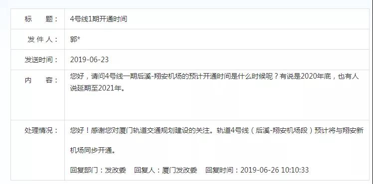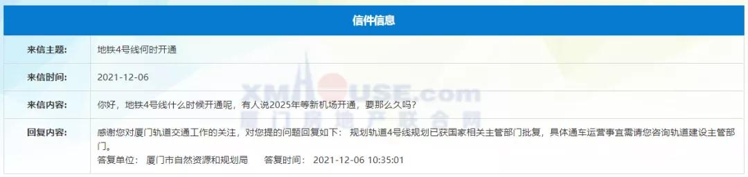 對(duì)此,廈門市自然資源和規(guī)劃局給出回復(fù):規(guī)劃軌道4號(hào)線規(guī)劃已獲國(guó)家相關(guān)主管部門批復(fù),具體通車運(yùn)營(yíng)事宜需請(qǐng)您咨詢軌道建設(shè)主管部門。