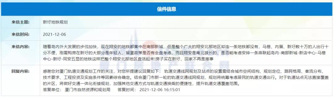 網(wǎng)友:希望安排一條地鐵,盤活翔安北部!