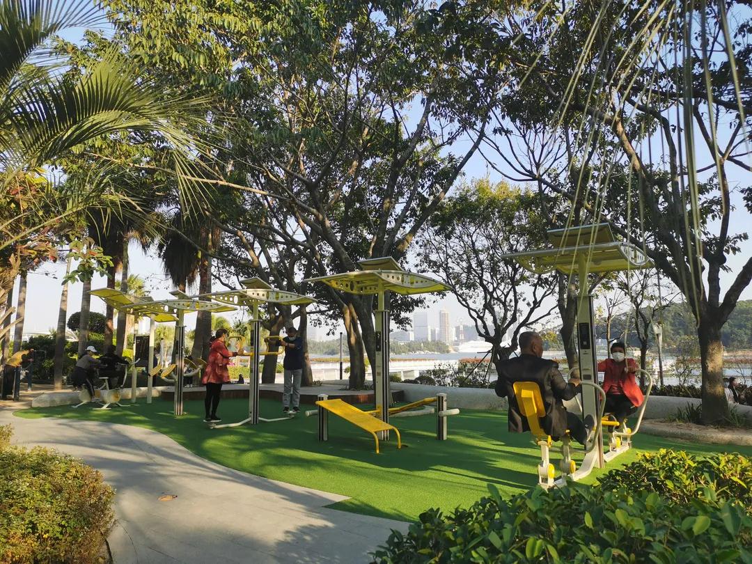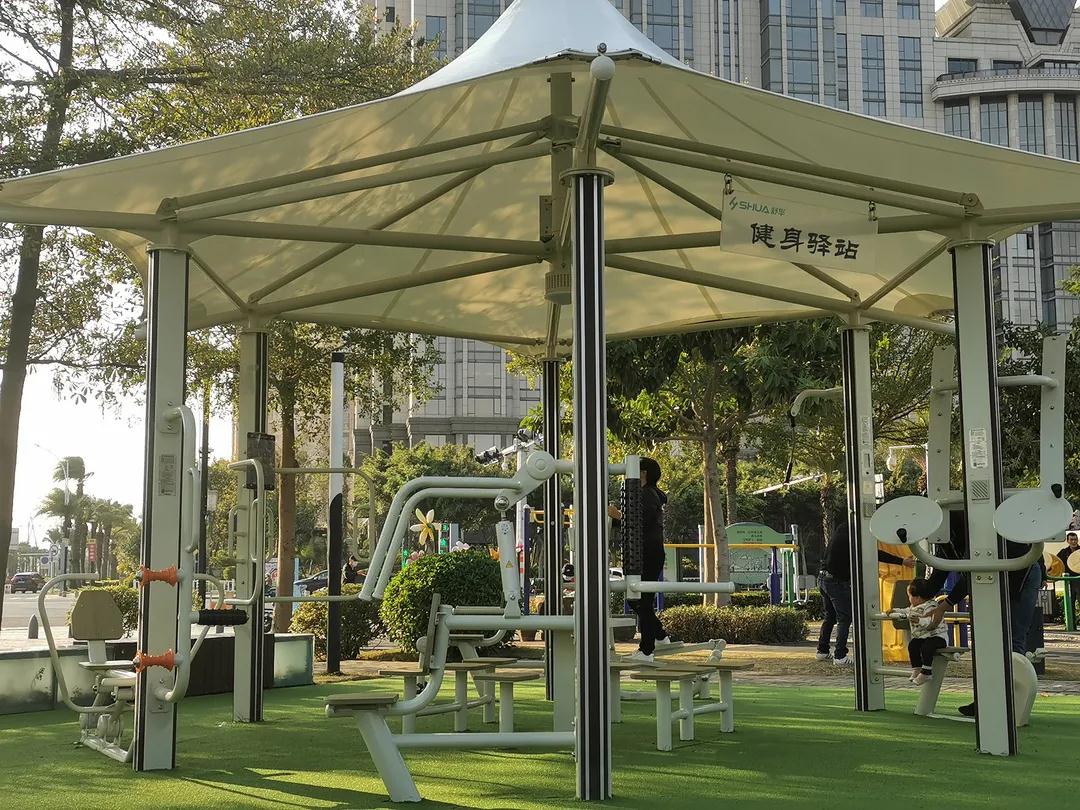 海滄灣畔,綠樹掩映之下,以米白為主色調(diào)、六角亭為造型的智能健身驛站別具風情。這處位于中駿天峰對面的智能健身驛站,中間安放著一張象棋桌,四周設置太極揉推器、劃船機、健身車等12樣不同的戶外健身器械。