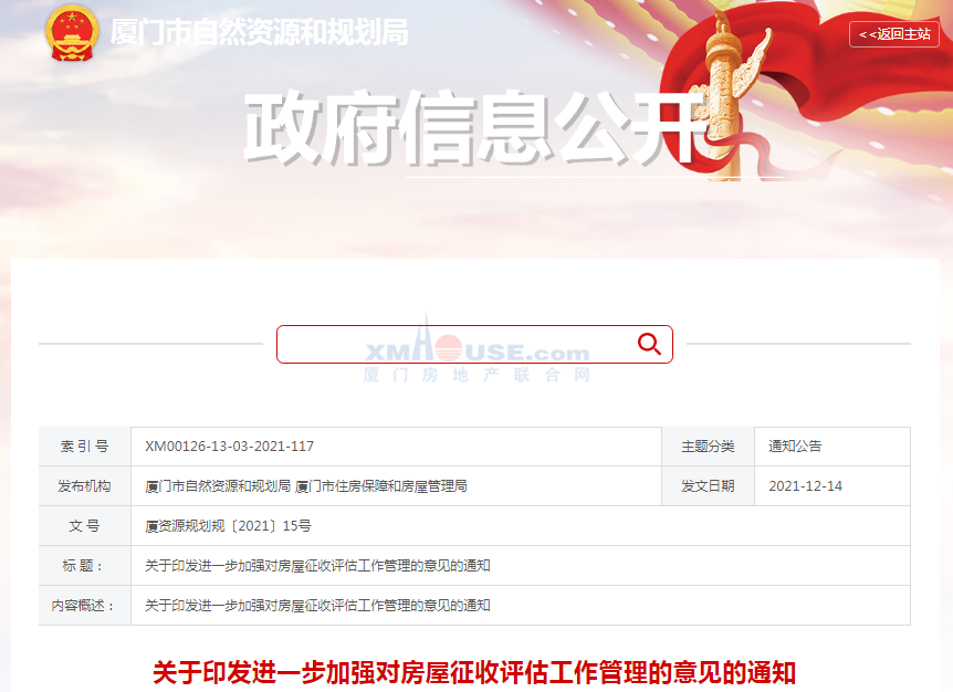 剛剛,廈門市自然資源和規(guī)劃局、廈門市住房保障和房屋管理局聯(lián)合發(fā)布關(guān)于印發(fā)進(jìn)一步加強(qiáng)對(duì)房屋征收評(píng)估工作管理的意見的通知。