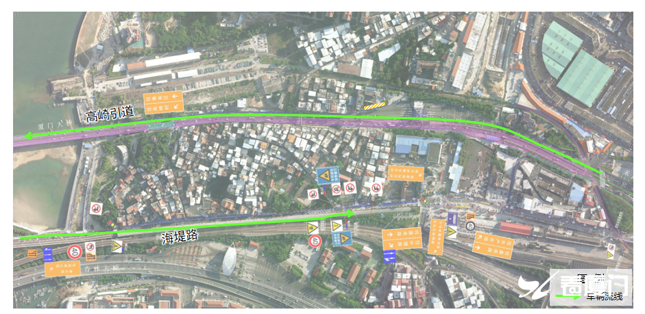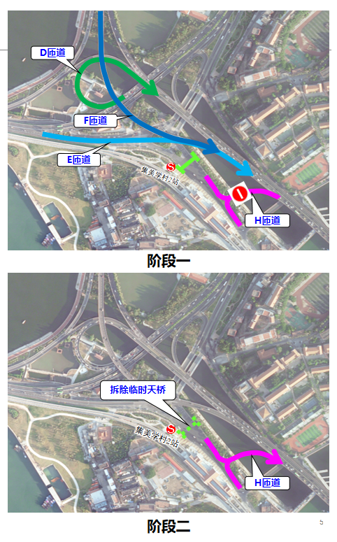 二階段:預(yù)計自2021年12月26日起,拆除學(xué)村轉(zhuǎn)盤旁臨時人行天橋,H匝道恢復(fù)通車,海堤路恢復(fù)雙向行駛;海堤路(集美學(xué)村站-高崎小學(xué)段)仍全天禁止大型車輛通行。