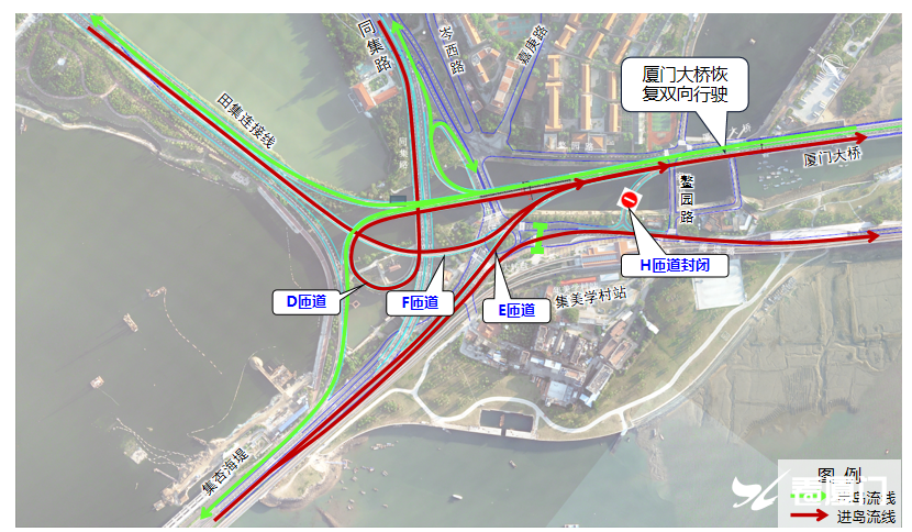 D、E、F三個匝道恢復(fù)通車,廈門大橋恢復(fù)雙向行駛,海堤路仍保持單向進島;