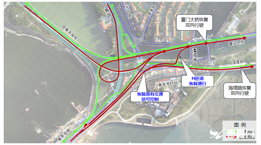 H匝道恢復(fù)通車,廈門大橋和海堤路均恢復(fù)雙向行駛,同步恢復(fù)集美學(xué)村大轉(zhuǎn)盤原有交通信號控制。