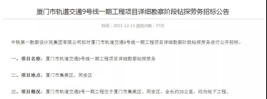 就在昨天,中鐵第一勘察設(shè)計(jì)院集團(tuán)有限公司發(fā)布廈門市軌道交通9號(hào)線一期工程項(xiàng)目詳細(xì)勘察階段鉆探勞務(wù)招標(biāo)公告。