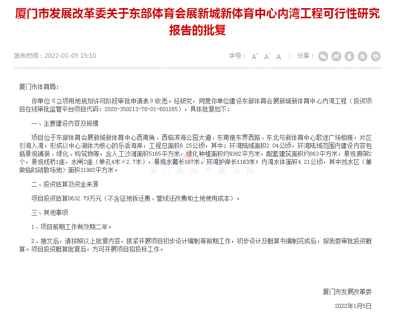 近日,廈門市發(fā)展改革委發(fā)布關(guān)于東部體育會展新城新體育中心內(nèi)灣工程可行性研究報告的批復(fù),同意建設(shè)東部體育會展新城新體育中心內(nèi)灣工程。