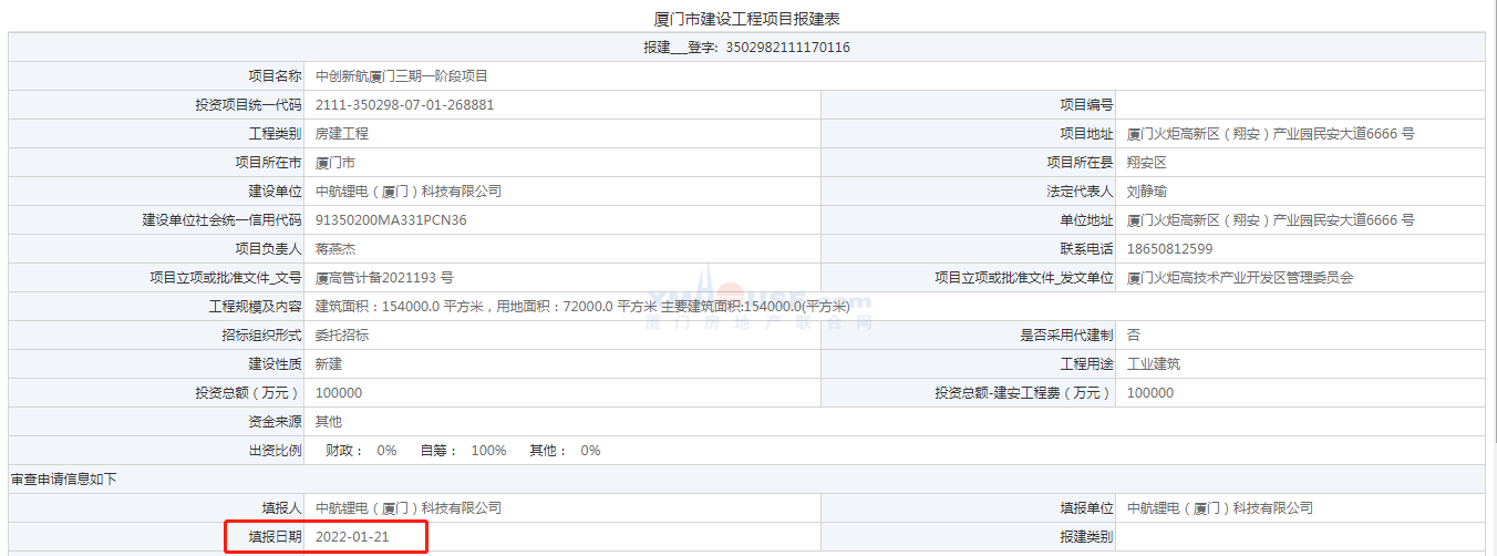 近日,中創(chuàng)新航廈門三期一階段項目最新報建信息公布,該項目位于廈門火炬高新區(qū),建筑面積154000平,用地面積72000平 主要建筑面積154000平,總投約100000萬。