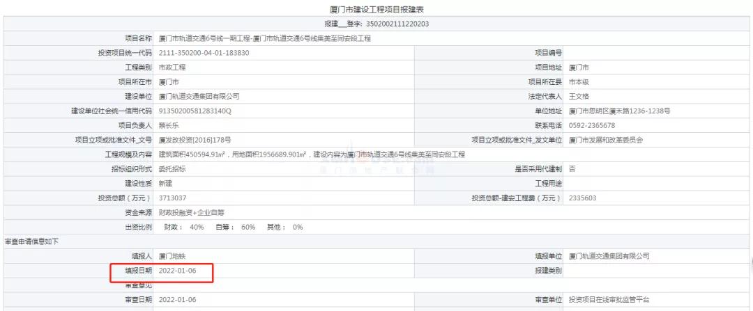 根據(jù)報(bào)建信息顯示,項(xiàng)目建筑面積450594.91㎡,用地面積1956689.901㎡,建設(shè)內(nèi)容為廈門市軌道交通6號(hào)線集美至同安段工程,總投資約3713037萬元。