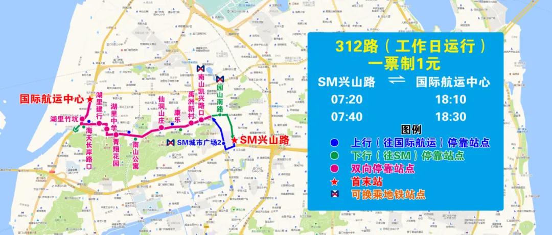 為方便興山路周邊的裕發(fā)花園、天成花園等居住區(qū)乘客往返康樂小學(xué)、湖里中學(xué)的上下學(xué)出行需求,新增312路工作日高峰專線。
