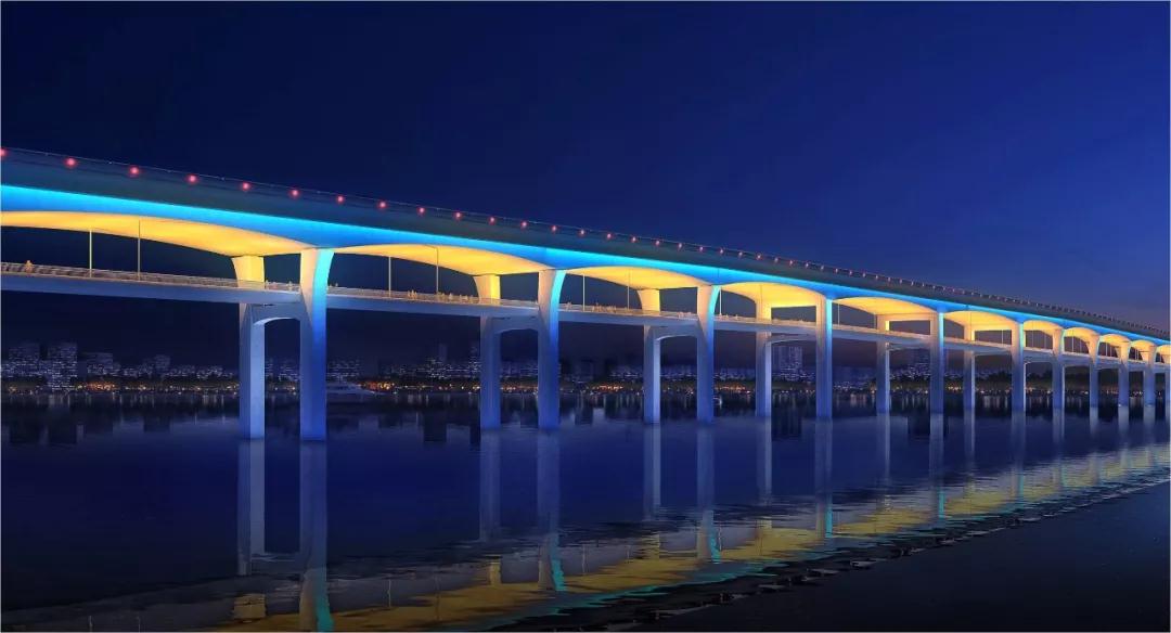 大橋橋面造型采用連續(xù)拱的形式,結(jié)合燈光處理,夜景層次豐富,將成為新機(jī)場(chǎng)旅客進(jìn)出廈門(mén)市的第一印象及地標(biāo)性建筑。