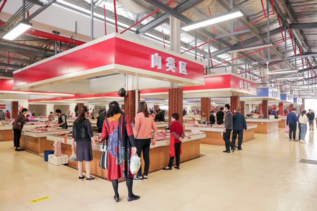 目前農(nóng)貿(mào)市場內(nèi)設有攤位130個、店鋪82間,還配置了檢測室、變配電室、消控室、管理室等。6個出入口,讓居民出入更加便捷、不擁擠。