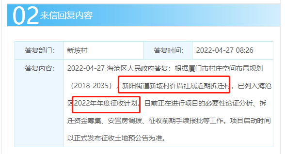● 新垵村許厝社:近期拆遷村,已列入海滄區(qū)2022年年度征收計(jì)劃。