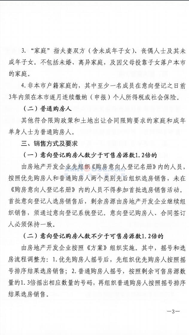 由房地產(chǎn)開發(fā)企業(yè)按照《方案》組織實施。其中,搖號和選房流程調(diào)整為:1.優(yōu)先購房人搖號后,先組織優(yōu)先購房人按照搖號排序結(jié)果選房銷售;2.普通購房人搖號,按照剩余可售房源數(shù)量的1.3倍搖出相應數(shù)量的號碼,再組織普通購房人按照搖號排序結(jié)果選房銷售。