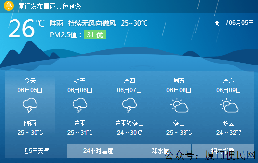 廈門便民網(wǎng)訊:昨日,在副熱帶高壓的掌控中,午間悶熱如蒸,廈門人重新陷入苦夏的煎熬。氣象部門預(yù)測,未來幾天,我市陣雨、雷陣雨多發(fā),特別是明天,雨勢較為明顯,局部地區(qū)還會(huì)有大雨。高考第一天,各地會(huì)有小陣雨,天氣相對涼爽,有利于考生發(fā)揮;第二天,大部分地區(qū)降雨停歇,氣溫會(huì)有所回升,午間有些悶熱,考生和家長要注意做好防暑降溫工作。
