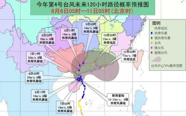 昨天,今年第四號臺風(fēng)正式生成了,其中心位于海南文昌以南大約250公里,北緯17.3度、東經(jīng)111.1度,臺風(fēng)中心將以每小時(shí)15公里左右的速度向偏北方向移動(dòng),強(qiáng)度將有所加強(qiáng),預(yù)計(jì)今天上午可能擦過或登陸海南東北部沿海(熱帶風(fēng)暴級,20-23米/秒,8-9級),6日下午至7日早晨登陸廣東西部沿海(強(qiáng)度達(dá)熱帶風(fēng)暴-強(qiáng)熱帶風(fēng)暴級)。