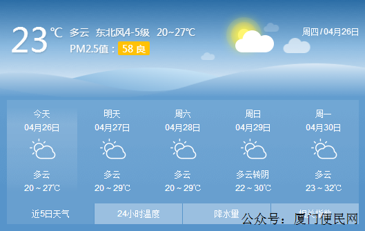 廈門便民網(wǎng)訊:最近廈門的天氣一句話就能概括:七上八下。扎心了有沒有?這兩天氣溫進(jìn)入隨機(jī)減模式,眼看“五一”小長(zhǎng)假就要到了,過幾天天氣究竟適不適合出門浪呢?便民小編今天就告訴你↓↓