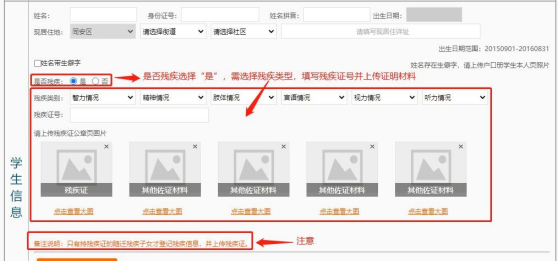 是否殘疾:系統(tǒng)默認(rèn)選擇“否”,如果該學(xué)生殘疾請(qǐng)選擇“是”,并選擇殘疾類型、填寫殘疾證號(hào)和上傳證明材料,如果是多重殘疾請(qǐng)選擇多個(gè)殘疾類型。