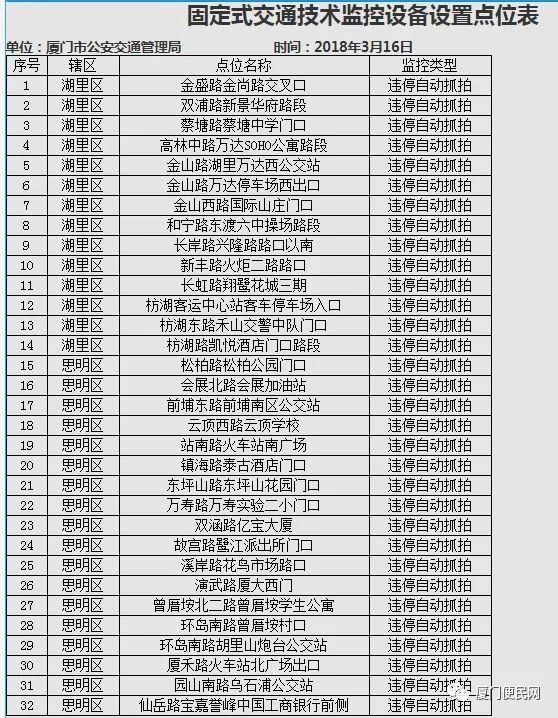 廈門便民網(wǎng)訊:廈門島內(nèi)新增32處監(jiān)控!廈門市公安交通管理局最新公布,新增固定式交通技術(shù)監(jiān)控設(shè)備設(shè)置地點(diǎn)32處,其中,湖里區(qū)14處,思明區(qū)18處,監(jiān)控類型都為違停自動抓拍
