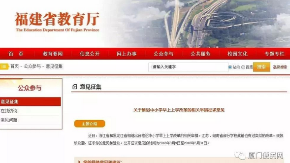 廈門便民網(wǎng)訊:福建有望推遲中小學(xué)早上上課時間!省教育廳近日悄悄在其官方網(wǎng)站上征集大家對推遲中小學(xué)早上上學(xué)改革的意見。官方并未提出要推遲多久上學(xué),不過,這一舉動被認(rèn)為是福建有望推遲中小學(xué)上課時間的一個信號。