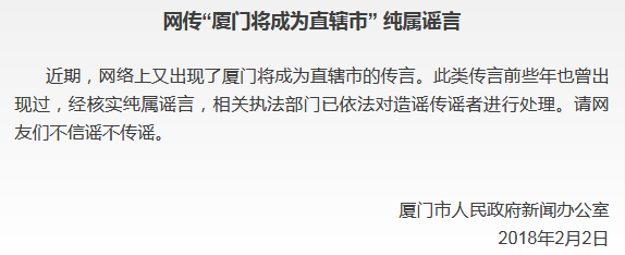 廈門便民網(wǎng):近期,網(wǎng)絡(luò)上又出現(xiàn)了,廈門將成為直轄市的傳言!對此,市人民政府新聞辦公室對相關(guān)謠言進行了澄清