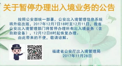 要辦理出入境的小伙伴注意了!12月7日至11日福建將暫停辦理所有出入境業(yè)務(wù)。