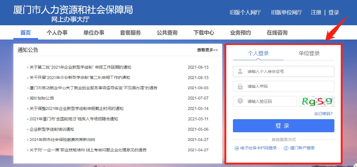 登錄廈門市人力資源和社會保障局官方網(wǎng)站,選擇“網(wǎng)上辦事”中的“網(wǎng)上辦事大廳”,填寫賬號和密碼,登錄后選擇個人辦事欄目中的“社保信息查詢”中的“社保繳費信息”,即可查詢個人城鄉(xiāng)醫(yī)保繳費情況。具體操作步驟如下: