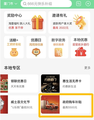 在首頁下拉,找到“本地專區(qū)”中的“政府購車補(bǔ)貼”
