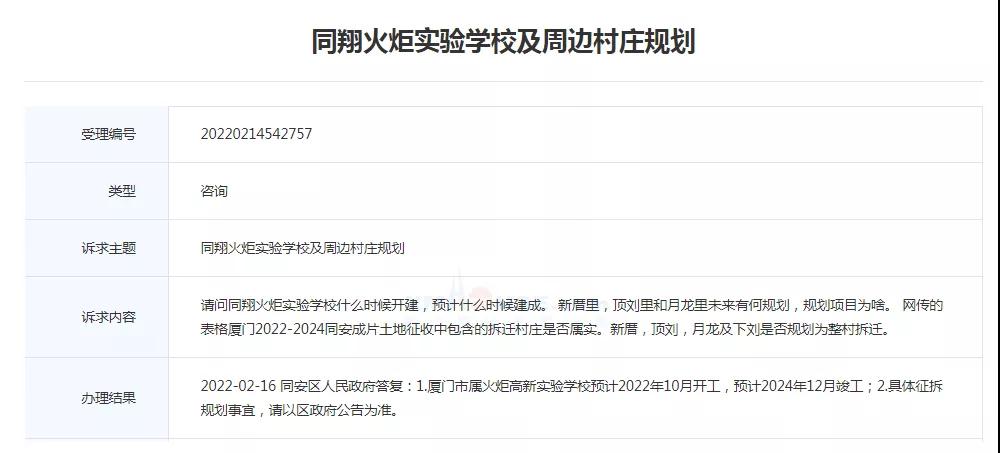 對(duì)此, 同安區(qū)人民政府答復(fù):1.廈門市屬火炬高新實(shí)驗(yàn)學(xué)校預(yù)計(jì)2022年10月開(kāi)工,預(yù)計(jì)2024年12月竣工;2.具體征拆規(guī)劃事宜,請(qǐng)以區(qū)政府公告為準(zhǔn)。