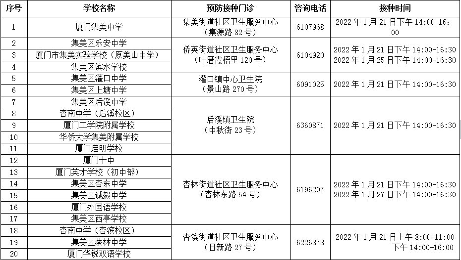集美轄區(qū)各個(gè)社區(qū)衛(wèi)生服務(wù)中心預(yù)防接種門診(如下表格所示)。