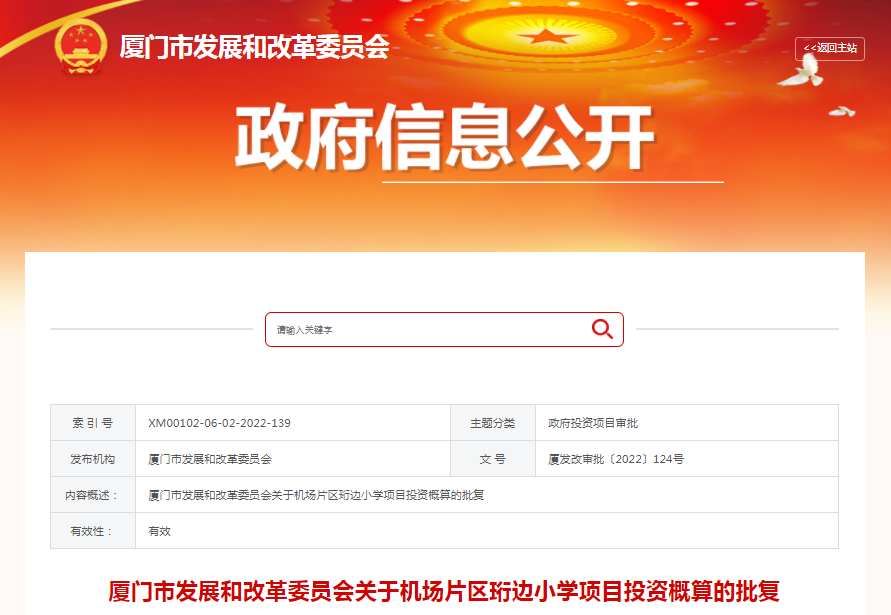 剛剛,廈門市發(fā)展和改革委員會發(fā)布關于機場片區(qū)珩邊小學項目投資概算的批復,同意批準機場片區(qū)珩邊小學項目投資概算。