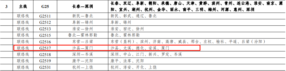 鶴崗—大連、黑河—大連、綏化—沈陽、煙臺(tái)—上海、山海關(guān)—深圳、威海—汕頭、烏蘭浩特—海安、二連浩特—淅川、蘇尼特左旗—北海、滿都拉—防城港、銀川—榕江、蘭州—龍邦、策克—磨憨、西寧—瀾滄、馬鬃山—寧洱、紅山嘴—吉隆、阿勒泰—塔什庫爾干、霍爾果斯—若羌、喀納斯—東興、東營—深圳、同江—哈爾濱、嘉蔭—臨江、海口—三亞(東)、???mdash;三亞(中)、海口—三亞(西)、張掖—孟連、丹東—東興、饒河—蓋州、通化—武漢、嫩江—雙遼、牙克石—四平、克什克騰—黃山、興隆—陽江、新沂—海豐、蕪湖—汕尾、濟(jì)寧—寧德、南昌—惠來、正藍(lán)旗—陽泉、保定—臺(tái)山、呼和浩特—北海、甘其毛都—欽州、開縣—憑祥、烏海—江津、巴中—綠春、遂寧—麻栗坡、景泰—昭通、蘭州—馬關(guān)