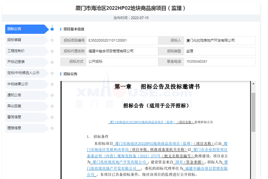 剛剛,廈門(mén)市海滄區(qū)2022HP02地塊商品房項(xiàng)目(監(jiān)理)招標(biāo)公告發(fā)布。
