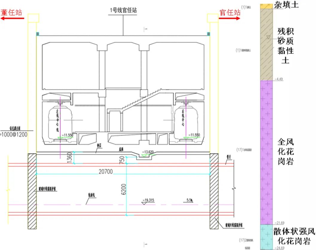 其中,盾構(gòu)下穿1號(hào)線官任站時(shí)要穿越車站既有樁基32根,穿越期間距車站主體結(jié)構(gòu)最小的凈距只有0.75米,對(duì)結(jié)構(gòu)沉降和盾構(gòu)機(jī)姿態(tài)控制,提出了極為嚴(yán)格的要求。