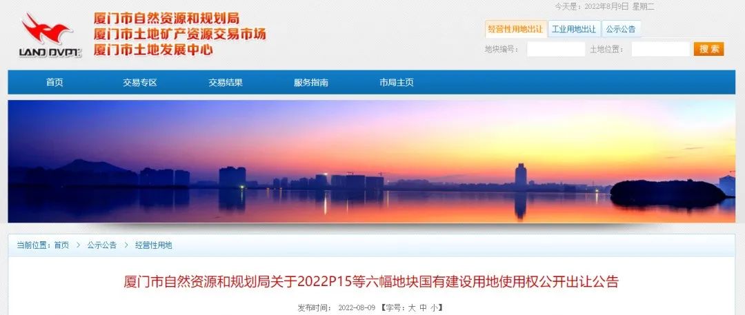 經(jīng)廈門市人民政府批準(廈府[2022]286號),廈門市自然資源和規(guī)劃局決定公開出讓2022P15等六幅地塊的國有建設用地使用權?,F(xiàn)將有關事項公告如下: